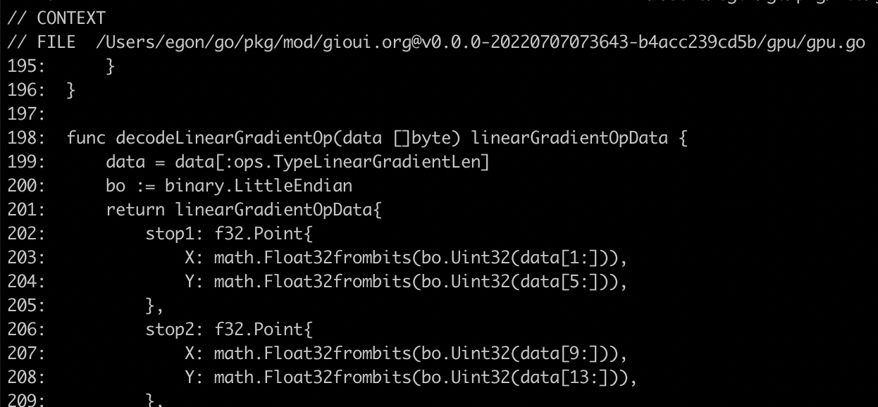 My story starts on a weekend when I was doing a bunch of tiny optimizations to the Gio UI project. There are ways to view the assembly; one is to use go tool objdump -s funcname from the command line. However, it's rather difficult to see how the source code and assembly are related.